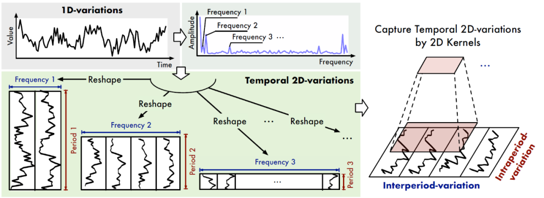 TimesNet尝试从一个全新的多周期视角分析时序变化。一维时间序列通过快速傅里叶变换选取多个周期,基于多个周期对一维数据进行折叠,得到多个二维张量,每个二维张量的列和行分别反应了周期内与周期间的时序变化。通过这种方式将一维时序数据扩展至二维空间进行分析。