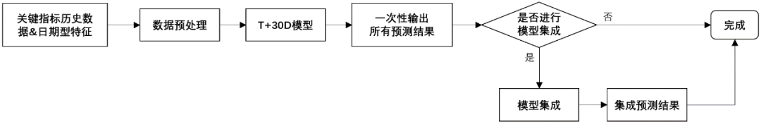 在离线训练模型完毕之后,我们将模型部署到了线上,每天更新T+30D的结果,流程如图所示: