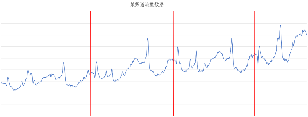 以某频道流量为例,画出去除疫情数据后的走势图,红线是以年为尺度进行分割,可以看出数据具有显著的年周期性。