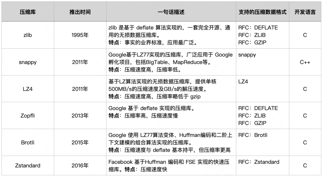 - 2010年后,各大型互联网公司陆续开源了新的压缩算法及实现,如:LZFSE(Apple)、Brotli(Google)、Zstandard(Facebook)等,在压缩速度和压缩比方面均有不同程度的提升。常见的压缩库如下(需要注意的是:由于压缩算法协议的差异,这些函数库不能交叉使用,数据压缩/解压缩必须使用同一种算法操作):