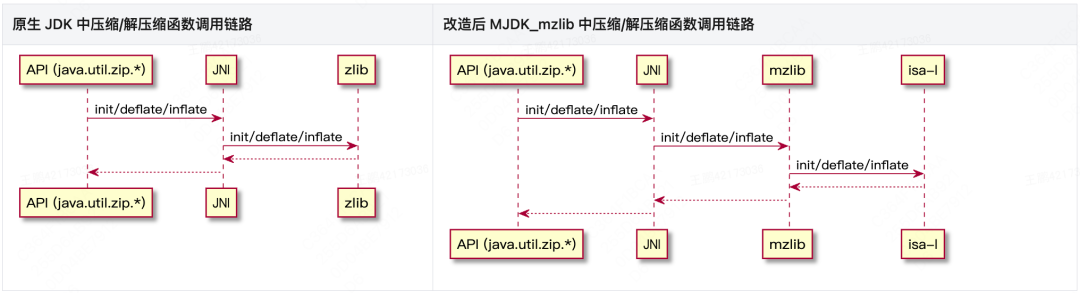 美团基础研发平台曾经开发过一种基于 Intel 的 isa-l 库优化的 gzip 压缩工具及 zlib[4] 压缩库(又称:mzlib[5] 库),优化后的压缩速度可提升 10 倍,解压缩速度能提升 2 倍,并已在镜像分发、图片处理等场景长期稳定使用。遗憾的是,受限于 JDK[6] 对压缩库调用的底层设计,公司 Java8 服务一直无法使用优化后的 mzlib 库,也无法享受压缩/解压缩速率提升带来的收益。为了充分发挥 mzlib 的性能优势为业务赋能,在 MJDK 的最新版本中,我们改造并集成了 mzlib 库,完成了JDK中 java.util.zip.* 原生类库的优化,可实现在保障 API 及压缩格式兼容性的前提下,将内存数据压缩速率提升 5-10 倍的效果。本文主要介绍该特性的技术原理,希望相关的经验给大家带来一些启发或者帮助。