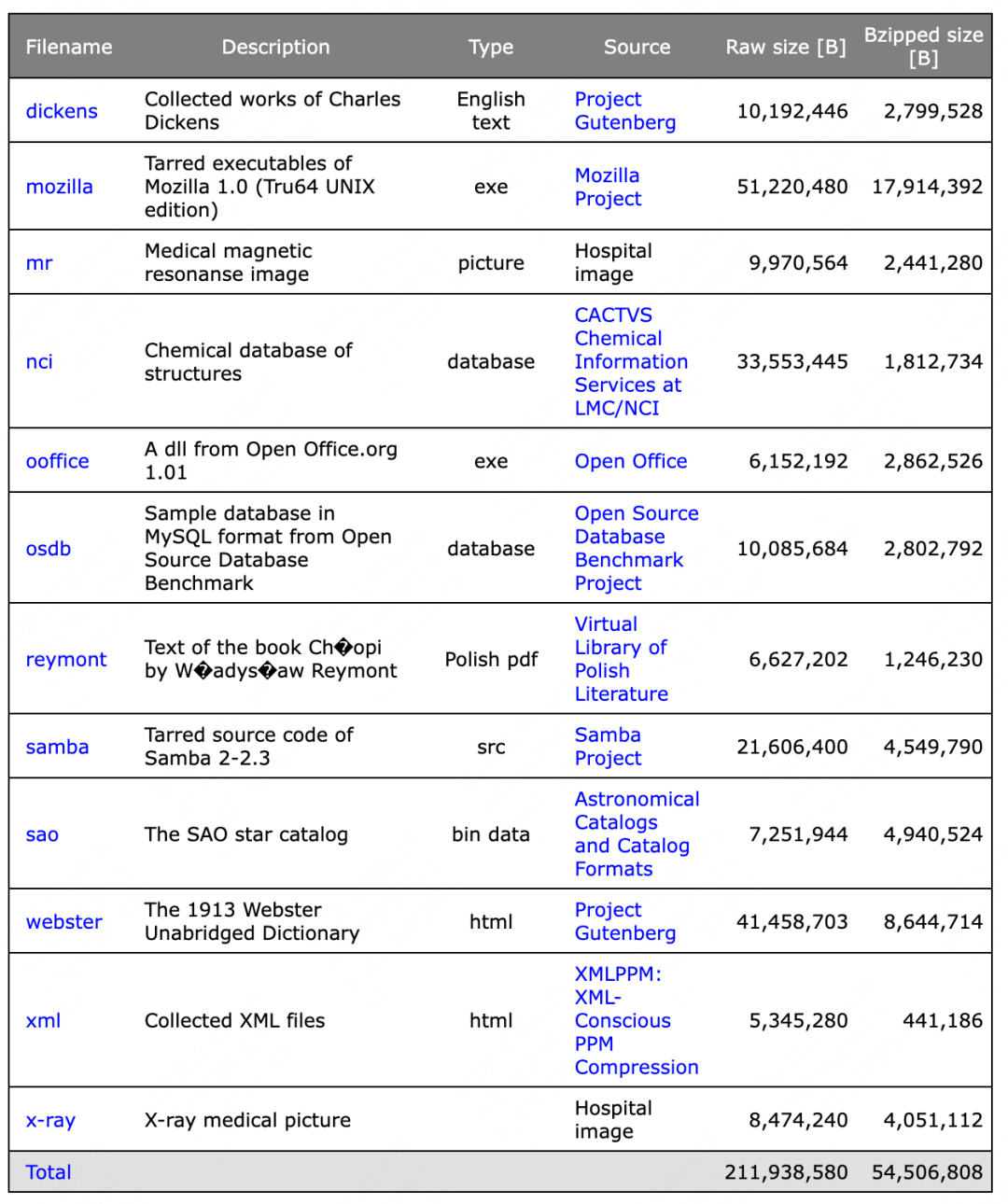Silesia corpus是压缩方法性能基准测试集,提供一套涵盖现时使用的典型资料类别的档案资料。文件的大小在6 MB 到51 MB 之间,文件格式包括 text、exe、html、picture、database、bin data 等。测试数据类别如下: