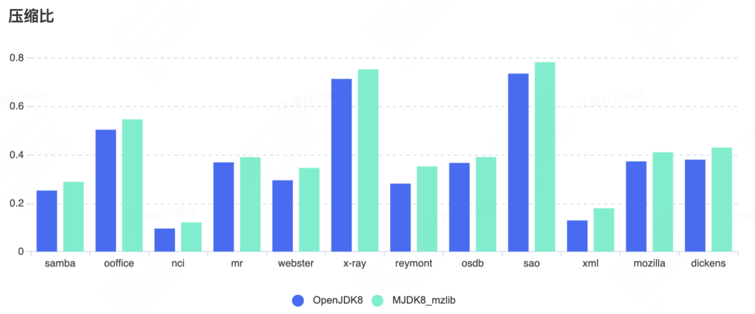 - 性能测试(通过):在同一基准 update 版本下,MJDK8_mzlib 数据压缩耗时比 OpenJDK8 降低 5-10 倍,压缩比无较大波动(增加 3% 左右)。