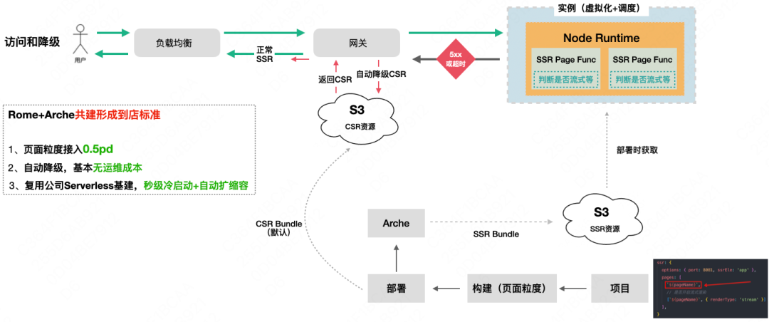 首先是访问自动降级,用户通过负载均衡命中对应的网关,命中对应的Serverless的Node Runtime,这里会有对应页面粒度的SSR渲染函数,当用户访问服务器返回 5.x.x 状态码或超时时会自动降级到CSR资源(SPA页面);即使出现了极端情况,比如 SSR 服务异常,我们也可以保证整体页面可用,差别主要在 SSR场景秒开~90%,CSR场景秒开~30%,兼顾了性能和稳定性的优势。