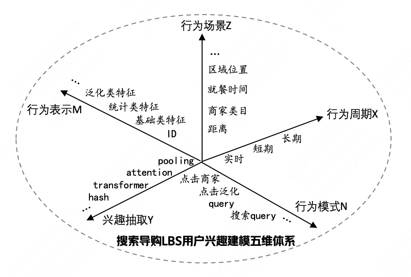 再次,结合外卖本身业务特色,用户的主要行为包括搜索/浏览/点击/加购/下单等行为,将这一系列动作归结为行为模式维度。