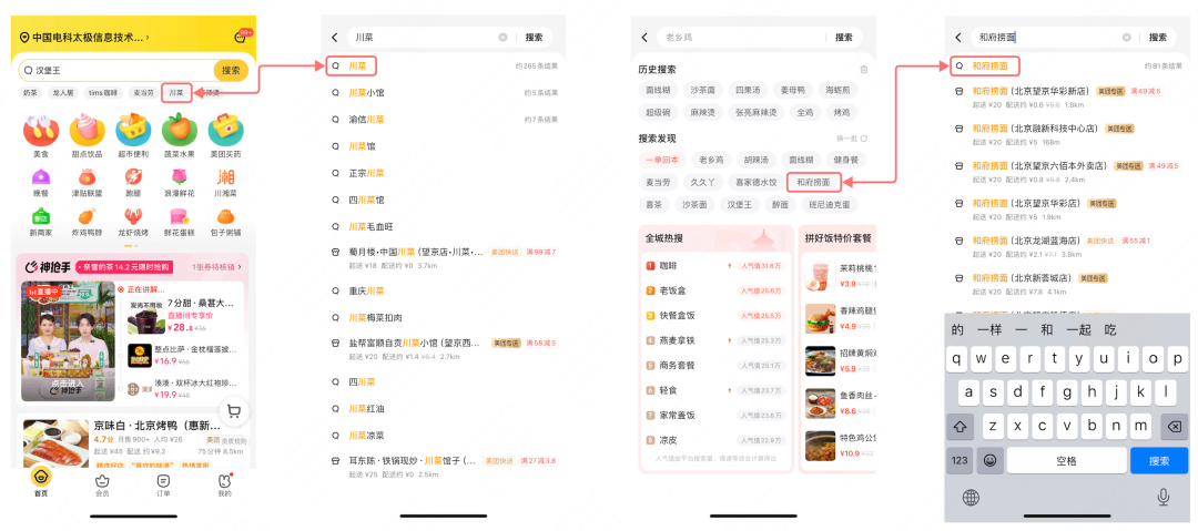 为了解决这个问题,我们尝试利用基于Alita的意图感知能力。如下方的视频演示,当用户在首页浏览商家并加购菜品“【爆款】麻酱凉皮”后返回首页,吸顶的搜索框中的框内词会自动更新,并轮播到新的搜索词“凉皮”,同时展示擦亮动效。当用户点击搜索按钮后,会直接跳转到搜索结果页,展示更多与凉皮相关的商家及菜品,帮助用户进行选购。
