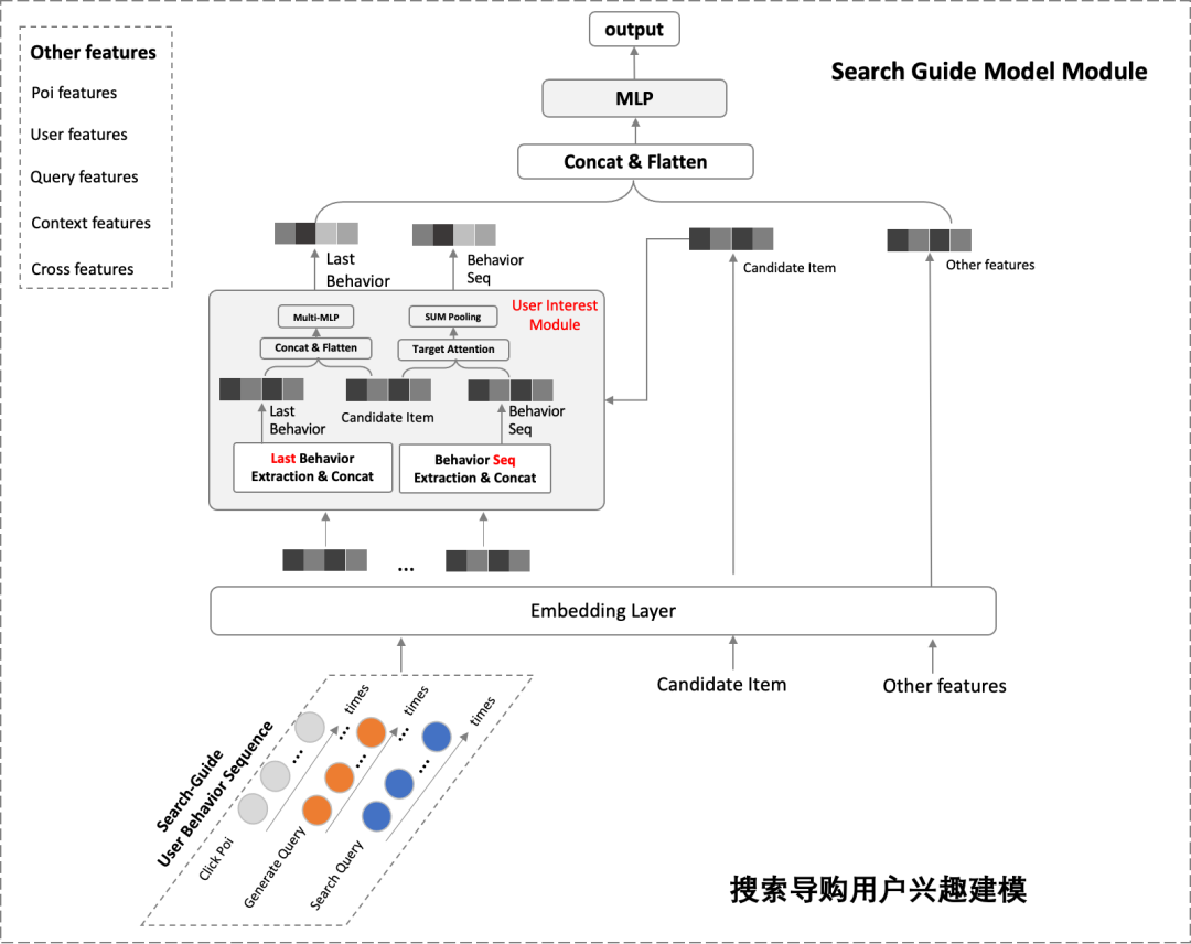 :鉴于场景冷启,我们刚开始直接使用了非智能刷新场景的导购排序模型(用户手动刷新场景调用的框内词模型),该模型引入了用户实时商家点击序列、实时搜索序列以及用户的Last Behavior进行联合建模。由于智能刷新场景有实时性要求更高的特点,如图5所示,我们在用户行为序列的使用中,融合了端上搜集的更为实时的信号,提升了用户行为序列的实时性。