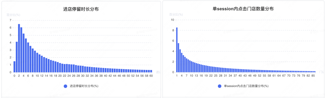 图4 进店停留时长分布(左)及单session内点击门店数量分布(右)
