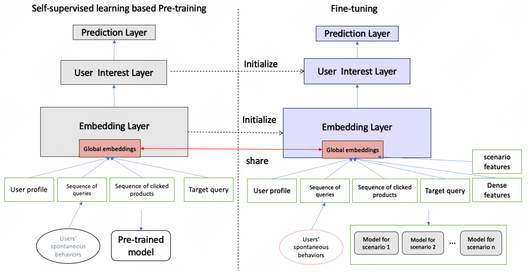 由于在预训练阶段让模型见到了更多其他场景的Query,我们可以在一定程度上缓解反馈闭环的问题。同时,在Fine-tuning阶段使用了全场景数据并对场景信息进行建模,所以我们的多个场景统一模型可以在缓解小场景和新场景过拟合问题的同时,还可以兼顾建模出不同场景的共性和特性。下面将分别介绍Pre-training和Fine-tuning。