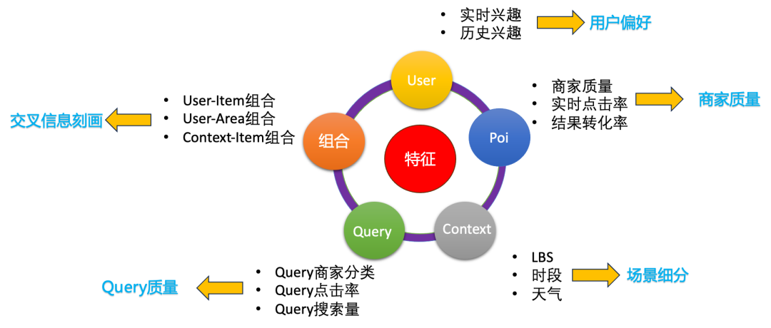 - Query维度:主要包括Query的搜索量、点击率以及成单率等统计特征,此外还包括Query的商家分类及分词信息。