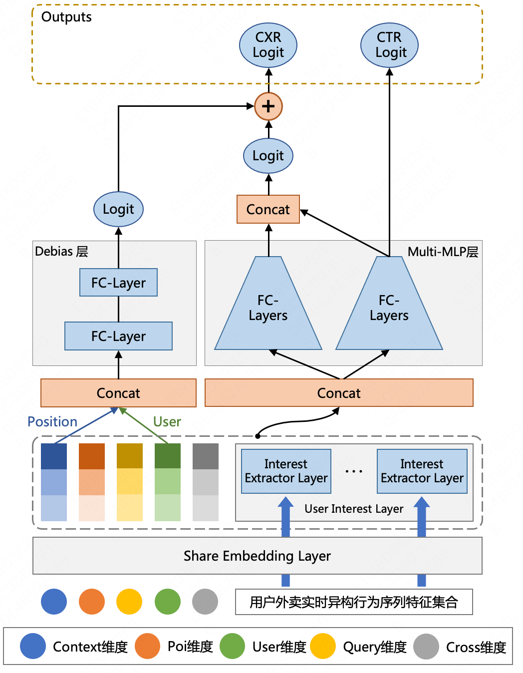 为解决这一问题,关键在于要让模型具有预估导购内点击/成单能力之外,还要有预估用户搜索全局点击/成单的能力。为此,我们将模型中的CTR/CXR的预估目标,由曝光后导购入口内点击/成单概率升级为曝光后搜索全局点击/成单概率这样一种可落地的实现方式。