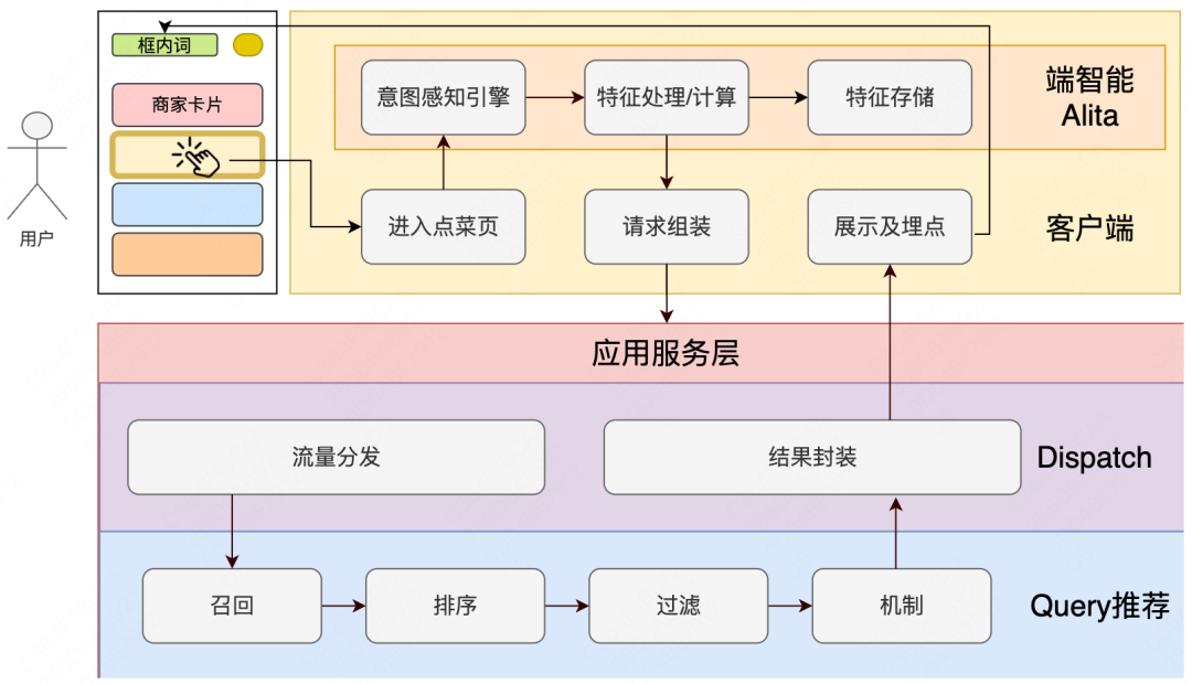 上图2展示了从“用户点击首页Feed商家卡片”开始,到框内词智能刷新的Query展现”的全流程。当客户端收集到用户进店行为后,调用Alita的意图感知引擎;满足框内词智能刷新的触发条件后,对用户在端上的进行特征处理、计算和存储,并将计算好的特征传递给客户端组装框内词智能刷新的请求;框内词智能刷新的请求经过应用服务层的Disptch透传给Query推荐的后端服务,经过召回、排序、过滤、机制、封装阶段,最终返回框内词智能刷新的结果到客户端进行展示。