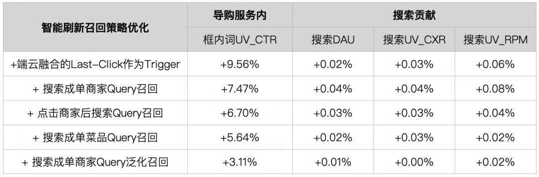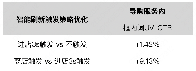 实验证明,放宽触发条件虽然会通过增加框内词智能刷新请求的曝光量,覆盖更多的用户,有利于后续策略迭代,但也会增大不置信触发的风险,导致框内词的效率下降。最终,我们选定将进店大于2s或者进店点击过菜品作为智能刷新的触发条件,两个条件满足其一即可。