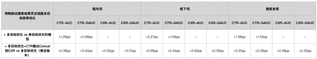 我们对导购联动搜索结果页全链路多目标效率优化进行了多组离线的消融实验,离线效果如下表所示: