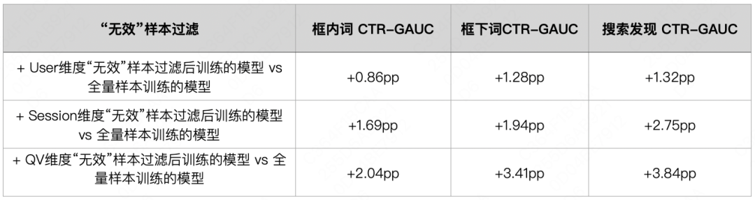 可以看到,User维度->Session维度->QV维度是过滤条件依次收紧的过程,通过下表的离线实验我们发现,对于三个场景GAUC的表现上,QV维度的“无效”样本过滤效果最佳。