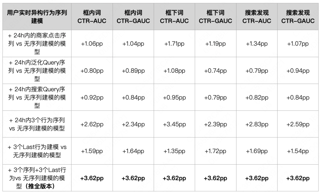 我们对用户实时异构行为序列建模进行了多组离线的消融实验,离线效果如下表所示: