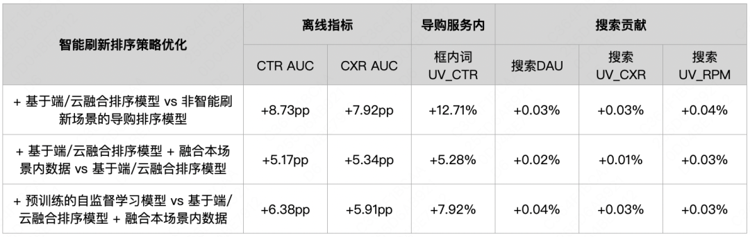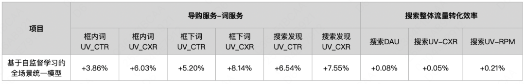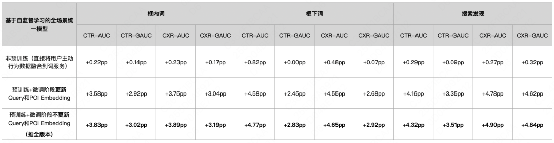 我们对基于自监督学习的全场景统一模型进行了多组离线的消融实验,离线效果如下表所示: