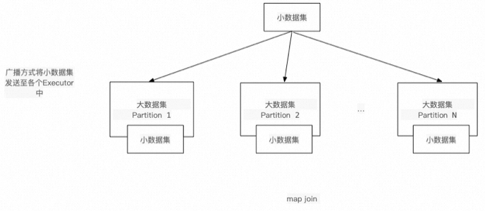 通过将需要join的小表分发至map端内存中,将Join操作提前至map端执行,避免因分发key值不均匀引发的长尾效应,复杂度从(M*N)降至(M+N),从而提高执行效率。ODPS SQL与Hive SQL使用mapjoin,SPARK使用broadcast。