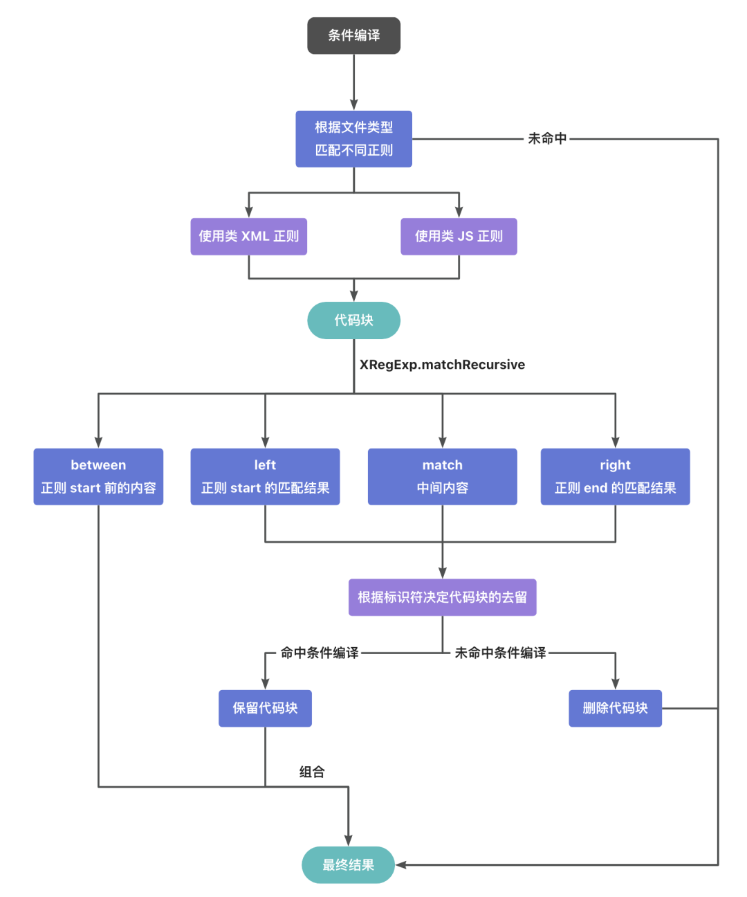 2.<span>XmlLikeFileExts</span>:命中各端小程序 XML 文件,如<span>.wxml</span>、<span>.axml</span>等。条件编译的正则也同样分为两类,命中<span>XmlLikeFileExts</span>规则的使用 xml 正则,命中<span>JsLikeFileExt<span>s</span></span>规则的使用 js 正则。