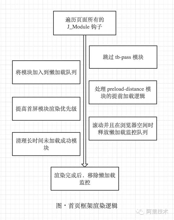 使用搭建平台搭建的页面,前端只需要考虑组成页面的原子模块的开发,整体的渲染由搭建平台提供的统一脚本全权负责。而在淘宝首页上,考虑到页面模块数量巨多,加上还有少量跨部门、跨团队的沟通,渲染模型略微不同。