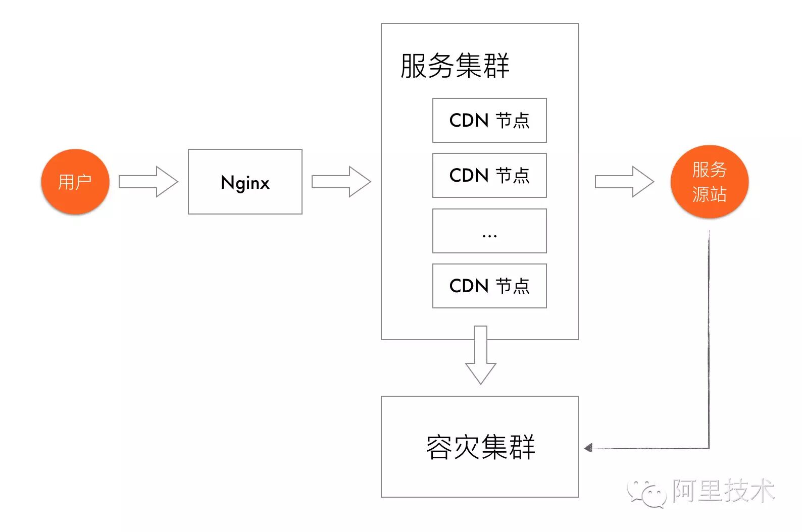 上图改变了下玩法,服务集群为 Cache CDN,它只有静态文件处理能力,没有 PHP/Node 的渲染能力,所以处理效率高,性能也好,抗压能力相当强,并且扛不住的时候还可以花钱买服务,拓展 Cache 集群。