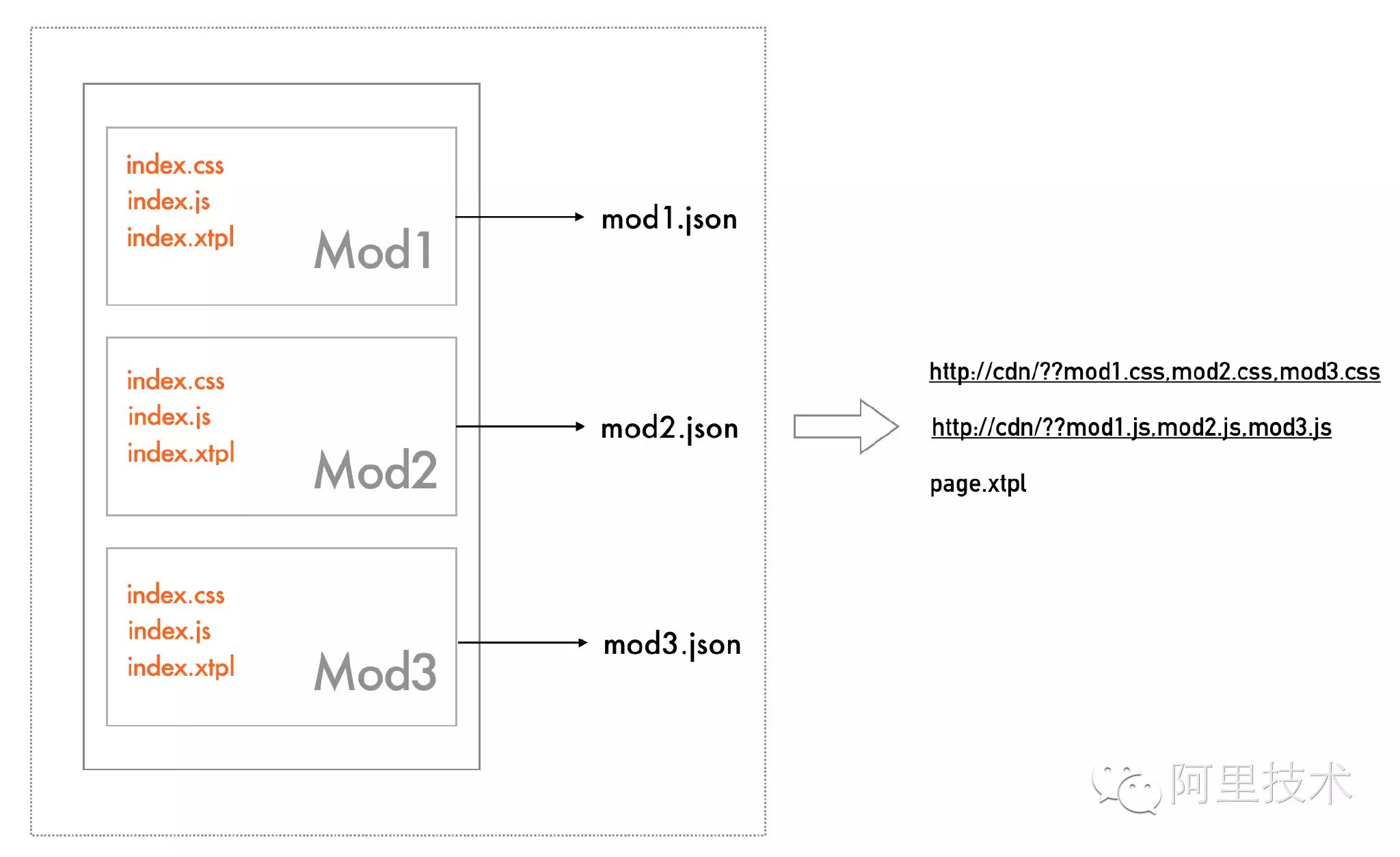 模块之间相互独立隔离,所以会存在一定程度的冗余,不过模块解偶带来的收益要比这点冗余要多得多。事实上,我们是通过一个仓库去管理单个模块的。页面的渲染就比较简单了,源站 Node 容器会将所有的 index.xtpl 合并成一个 page.xtpl,为减少页面请求,css 和 js 也会 combo 成一个文件,如上图所示的 http://cdn/??mod1.css,mod2.css,mod3.css