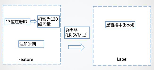 <span>0,0,0,0,0,0,0,1,0,0</span>, 正好第七个数为1,其他为0。这样,用户的13位注册ID可以表示为130维的布尔特征(feature),而将是否摇中,作为要预测的结果(label)。