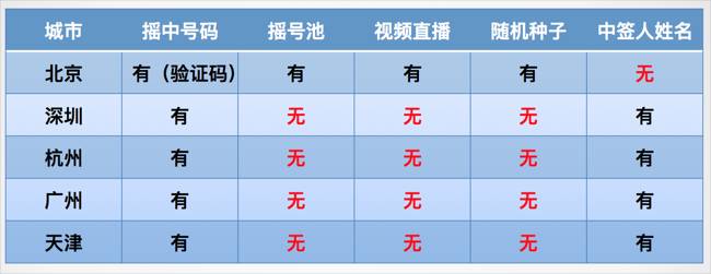 任何城市都不会同时提供以上五种全部信息。2013年以前,北京是提供中签者姓名的,可是因为一些特定姓名(如‘刘雪梅’)重复中签太多,导致舆论怀疑,后来就取消掉了。即使如此,北京依然是信息最为公开的。