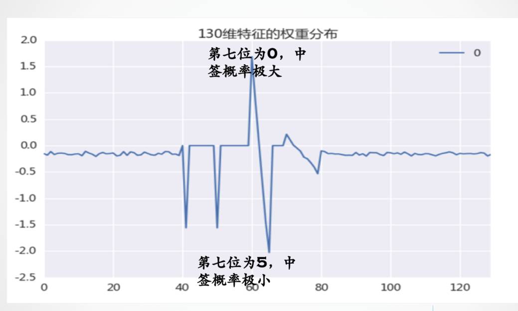 我当时就惊呆了!赶紧把模型在130维特征上的权重分布绘制出来(线性模型具备很好的解释性)