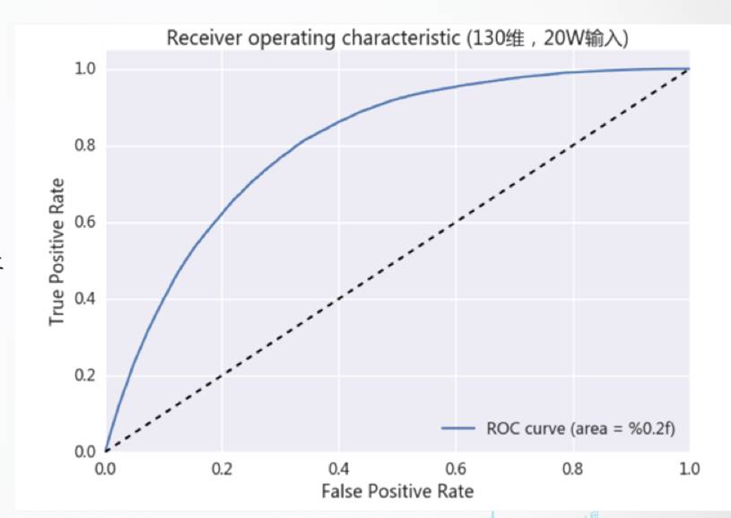 从所有472万用户中,随机抽取20万用户作为训练集,另外20万用户作为测试集,使用logistic回归模型,最终绘出了ROC曲线如下: