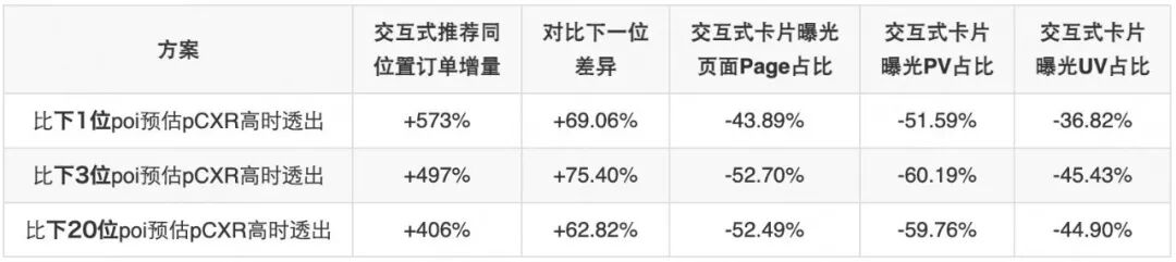 由于限制了卡片的透出条件,交互式卡片曝光量明显下降。实验证明,当交互式推荐卡片对比下1位商家卡片的pCXR更高时,其同位置订单增量最高,曝光页面Page占比损失最少,策略最优。我们采用该方案。从实验数据看出,对比下N位pCXR均值时,随着N取值的变化,会影响交互式卡片的曝光量和效率,其效果与直接调整pCXR的过滤阈值α等同。在实际生产环境中,选取“交互式推荐同位置订单增量”较高时的参数α即可,这里我们取1。