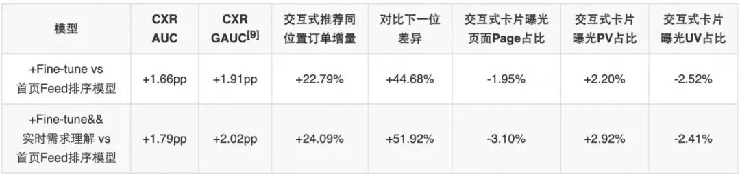 触发交互式推荐的商家特征,包含商家的embdding表示、配送信息、优惠信息等,排序模型离/在线效果如下表所示。可以看出,对比首页Feed排序模型,优化后的交互式推荐排序在卡片效率上显著优于直接使用首页Feed排序模型的效果。