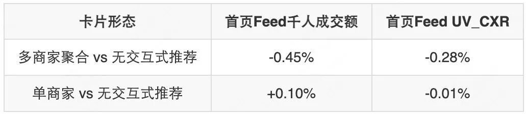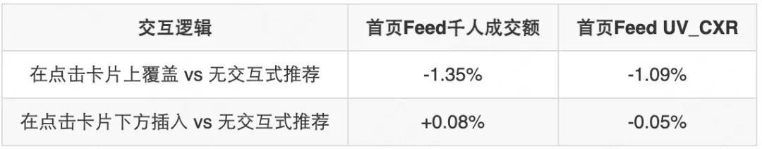 在观测不同产品形态的效果差异时,我们重点关注插入的交互式卡片对于首页Feed的千人成交额的影响,实验数据见下表:
