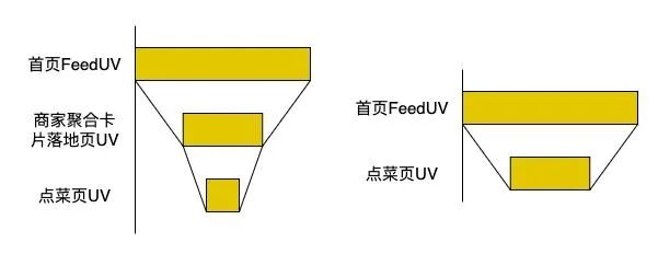 图2 转化漏斗:多商家聚合卡片转化漏斗(左),单商家卡片转化漏斗(右)