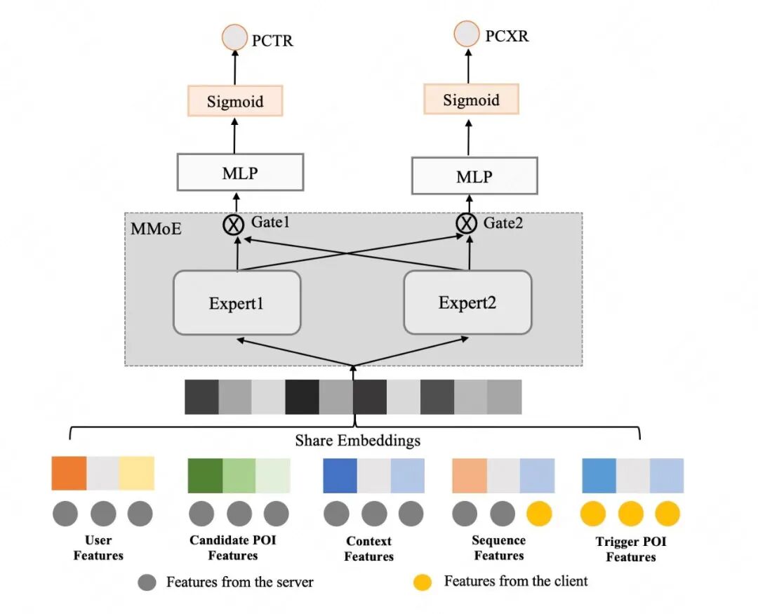 输入模型的Embdding数据,经过MMoE[7]层和3层的MLP网络,得到预测的pCTR、pCXR结果。其中,模型的输入特征分为5种类型:1)用户特征;2)商家特征;3)上下文特征;4)序列特征;5)触发交互式推荐的商家特征。序列特征,包含了实时曝光、点击等序列,并且使用了Micro-Behavior[8]详细信息。