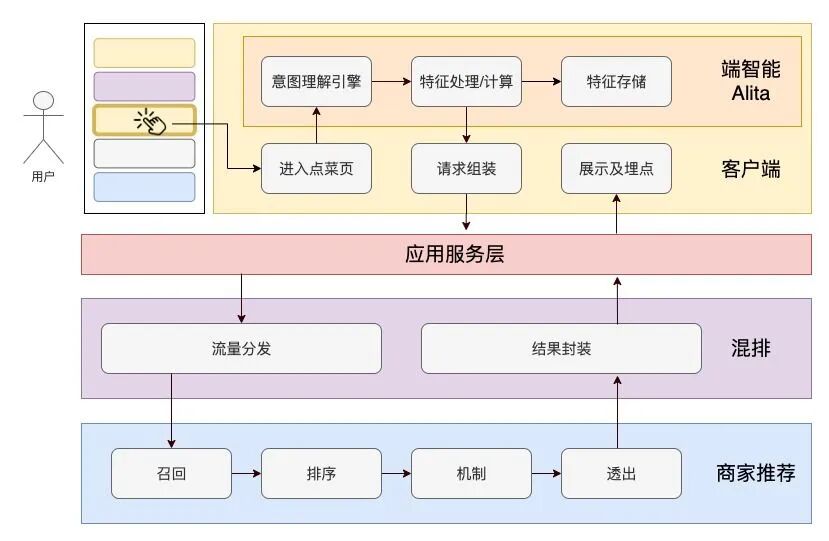 上图1展示了从“用户点击首页Feed商家卡片”开始,到交互式推荐卡片展现”的全流程。用户进入点菜页后,由客户端调用端智能的意图理解引擎;满足交互式推荐的触发条件后,进行特征处理、计算和存储,并将计算好的将特征传递给客户端组装推荐请求;推荐请求由应用服务层透传给混排服务,再由混排调用商家推荐模块,经过召回、排序、机制、透出阶段,最终返回结果到客户端进行展示。