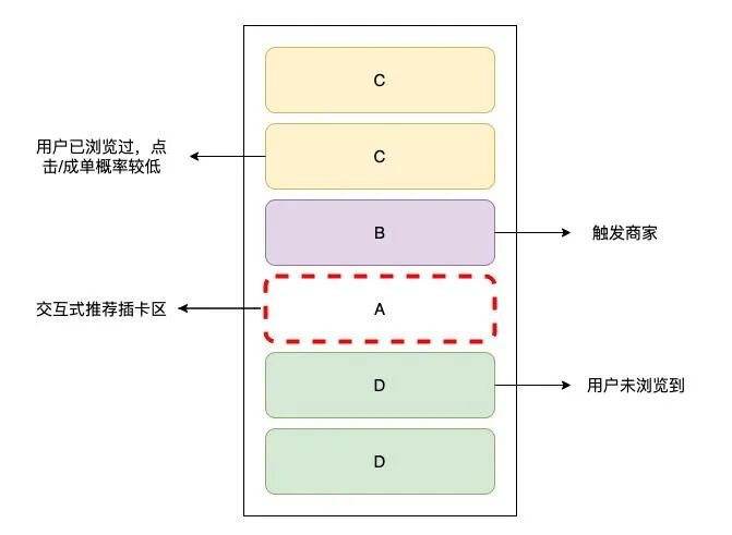 如下图7所示,商家展示区域划分为ABCD四个区域:交互式推荐插卡位置(A)、触发商家(B)、触发商家上文(C)、触发商家下文(D)。交互式卡片插入后,D区域第一位商家下滑,动画效果会将用户的注意力吸引到交互式卡片A上。但是,用户是否在交互式推荐的商家A中成单,不仅和它是否满足用户偏好相关,还离不开和上下文商家C、B、D的对比效果——至少,A应该比C、B、D区域的商家更符合用户当前意图。