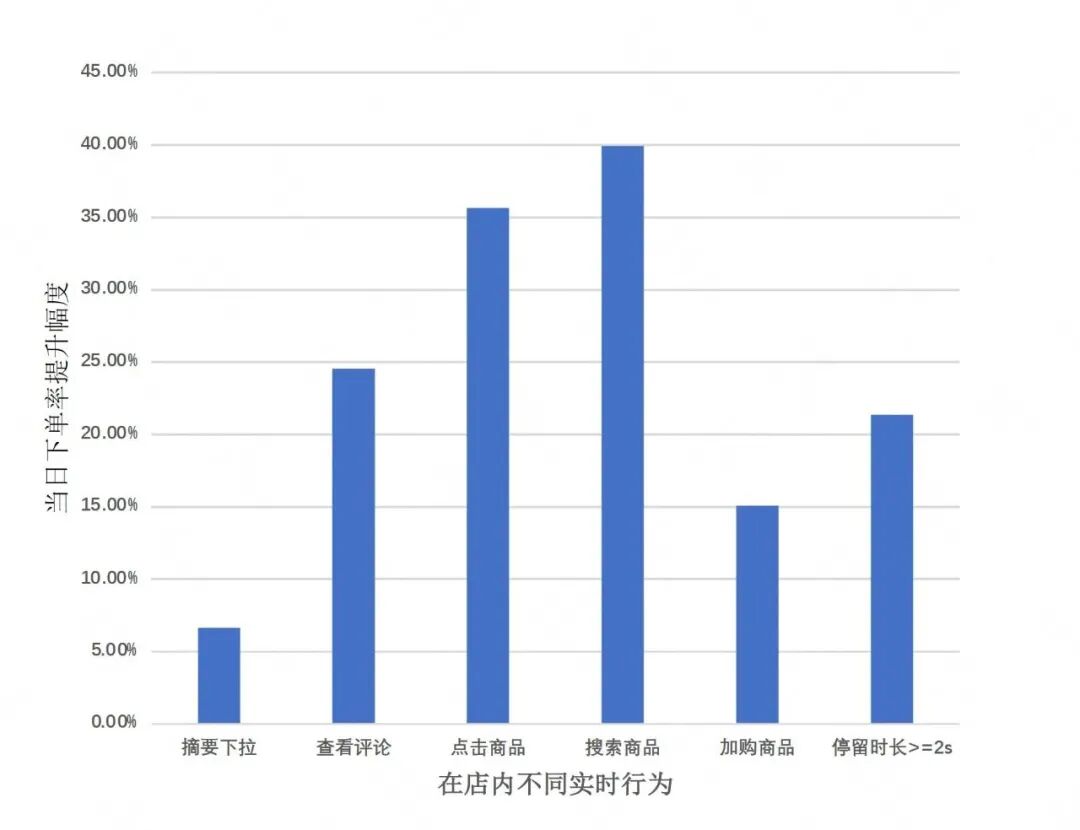 用户点击商家卡片后在店内的主要行为可以帮助我们更好理解用户实时需求。图4(a)展示了部分店内行为,图4(b)分析了部分不同的行为对比查看商家介绍行为,在用户当日完单率(当日完单率定义:当日用户在商家内发生某一行为,并在该自然日内外卖有成单)上的差异,说明不同行为下用户的需求有明显差异。