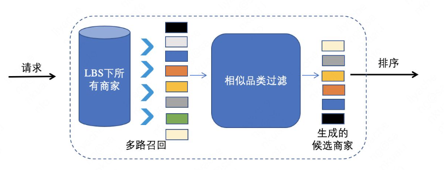 - 利用多个召回算法策略从用户附近召回数百个候选POI商家。