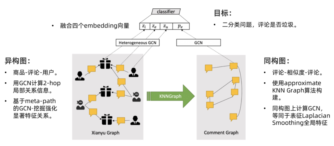 在闲鱼、淘宝等APP上存在的垃圾信息不仅会影响正常消费者的体验,也容易诱发欺诈、刷单等恶意行为,因此需要对垃圾评论进行有效的治理。在真实的垃圾评论识别场景中,风控系统和网络水军之间存在着激烈的对抗,我们需要使用更加多维度的信息识别变异的垃圾评论,提升黑产的对抗成本。与以往仅仅基于语言模型和统计特征的方法不同,我们提出的GCN-based Anti-Spam(GAS)系统,首次将图卷积网络(Graph Convolutional Networks)引入该领域,并且创造性地引入两个不同结构的图并进行融合以捕捉不同语义信息,大幅提升了系统对变异垃圾评论的识别覆盖率。阐述该技术的论文(《Spam Review Detection with Graph Convolutional Networks》)被国际学术顶会ACM CIKM 2019收录,并被评为最佳应用论文,被引用次数已达近百次。