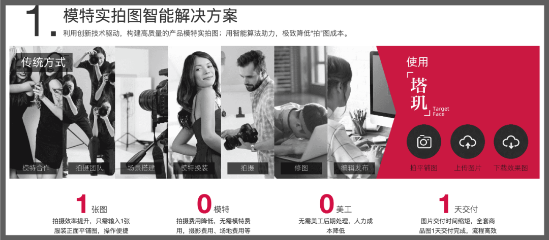 优质内容的生产对商家来说很重要,但成本也非常高,许多小商家难以负担,这也会在一定程度上催生和加剧侵权盗版问题。AI模特利用创新算法技术在目标人脸模块基础上,生成成千上万种五官组合,这样就能得到全世界独一无二的虚拟人脸;同时利用算法技术将服装平铺图转化成3D图“穿”在模特身上。商家在上传服装平铺图后,还可以自主选择不同的人脸、表情、妆容、身型、背景图等,为相应的服装进行搭配,从而形成自己特定的拍图风格。为了提升效果和逼真度,项目组团队也与北京服装学院进行合作,通过使用专业动捕设备来记录真正的模特形态和动作,用真实数据“加持”虚拟模特,力求最大程度的还原。该方案的一大亮点是低成本和便捷性,相比以往的3D人体重建往往需要多个摄像头或者连续的多帧影像,现在只需要商家提供一张平面图片,就可以生成专属的虚拟模特供商家使用。安全性是该方案的另一大特色,我们通过不可见的数字水印和虚拟人脸版权库来保证不被侵权盗用。虚拟模特“塔玑”在帮助数以万计的中小商家减少上新成本和缩短上新时间方面,发挥了重大作用;特别是对于疫情期间极为稀缺的外模、童模,起到了很好的替代作用。产品方案详见 https://yc.alibaba.com/#/targetFace