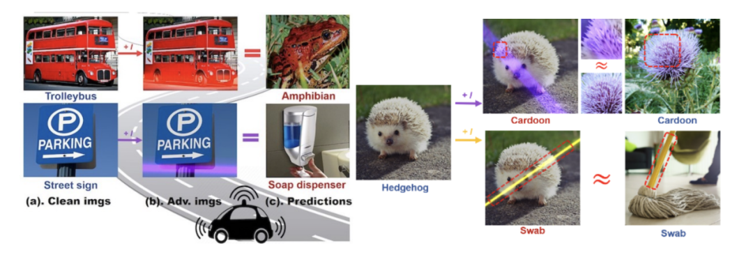 此前针对AI模型的安全问题,大部分研究工作主要聚焦在生成对抗样本。对抗样本作为一种非自然的人为添加的恶意干扰,可以使AI模型发生特定错误。然而,经我们研究发现,攻击AI远非需要人为去制造对抗样本,只需简单使用激光笔,就可以让AI模型不再有效。在这个工作中,我们设计了一种算法,可以模拟光束对AI模型的攻击效果,并在现实世界中得到验证。此外,我们也在大型数据集上做了广泛的分析,进一步探究其攻击的机理。我们的攻击方法也揭示了之前深度学习没有被研究过的弱点。例如,当将不同频谱的光束打在同一个物体上时,对于模型来说,局部变成紫色的刺猬等同于苜蓿。而光束本身形状对于模型也具有特别语义,例如拖把。该技术(《 Adversarial Laser Beam: Effective Physical-World Attack to DNNs in a Blink》)被计算机视觉领域的国际顶会CVPR 2021收录。