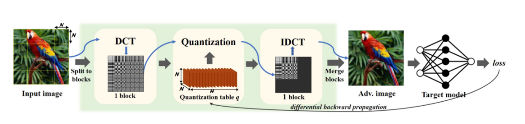 之前对抗样本的生产方式是在原始图片上加入人眼不可见的对抗噪声,从而使得模型识别结果出错。这类对抗样本中其实包含了原始图片的所有信息,因此理论上来说都无法抵挡图像预处理等防御手段。这也促使我们从一个相反的角度(即“做减法”)去重新思考对抗样本的不可感知属性。具体来说,这种攻击手段的独特之处在于我们并不直接对图片添加对抗扰动,而是通过优化量化表来实现信息丢失的操作。传统基于“做加法”的对抗攻击,模型用于识别图片的关键信息并没有丢失,只是被对抗噪声隐藏或弱化了,如果采用适当参数的去噪手段将导致增加的对抗噪声被去除或减弱,使得关键信息依然能够被模型提取,从而达到防御(至少是部分防御)的目的。我们这种基于信息丢失的方法所生成的对抗样本,由于已经将模型识别的关键信息丢弃了,因此常规的策略很难对这些信息进行恢复,很大程度上增加了对抗防御的难度。该技术(《AdvDrop: Adversarial Attack to DNNs by Dropping Information》)被计算机视觉领域的国际顶会ICCV2021收录。