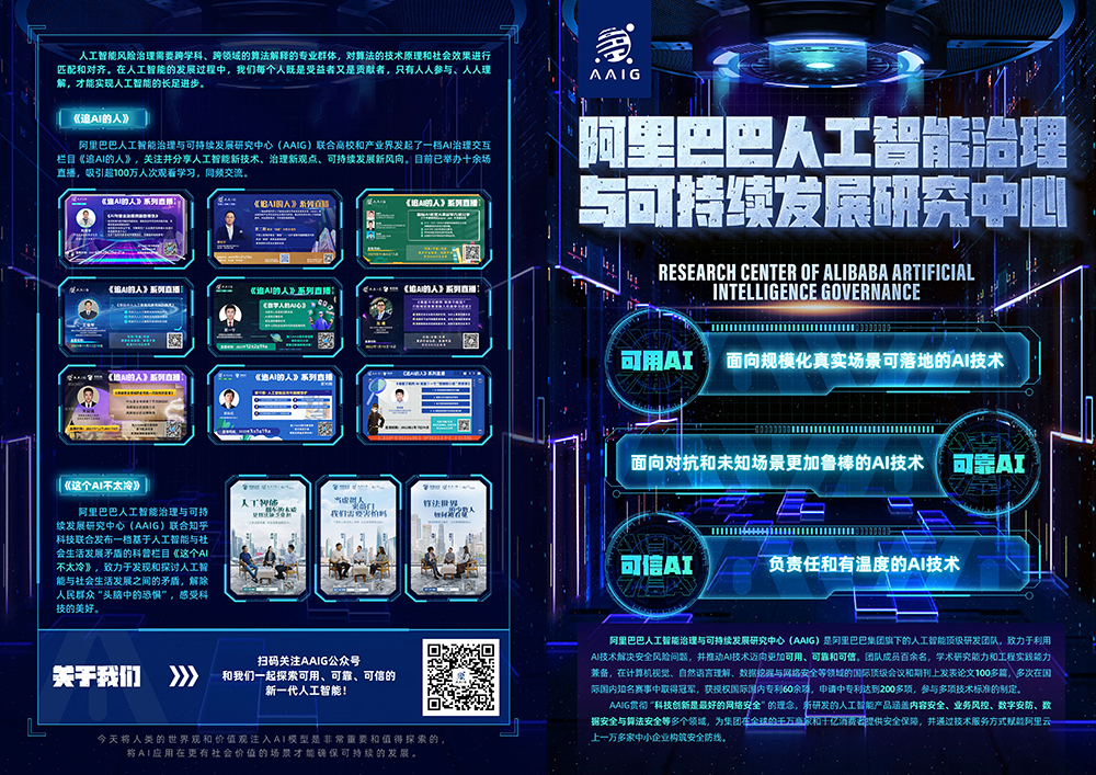 为持续探索并最终解决上述问题,在去年6月,阿里巴巴安全部算法研发团队升级成为人工智能治理与可持续发展实验室(Alibaba Artificial Intelligence Governance Laboratory,AAIG)。在新的品牌下,更加注重可持续AI的建设,努力践行“人人受益,责任担当,开放共享”的好科技。AAIG的技术方向涵盖以下几个方面: