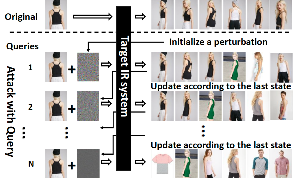 为分析图像检索系统在极限情况下的鲁棒性,一般的方法是使用对抗样本进行攻击测试,得到系统在受攻击情况下的各项性能指标。通常在模型未知的情况下,攻击者主要采用迁移攻击和查询攻击两种手段;前者是通过攻击已知替代模型生成对抗样本,后者则是通过不断地调用目标模型获取结果,借助反馈来优化对抗样本(也更接近真实情况)。相较于更加成熟的分类模型攻击,针对检索算法的查询攻击是更难的,原因在于检索系统的输出并不是置信度分值,而是没有标签的图片序列,导致攻击结果的好坏很难被量化。我们的工作证明了检索系统也能被攻破。我们首先定义并提出了一个基于相关性的损失函数,用来量化攻击的结果;为了减少查询攻击的请求量,引入模型窃取的思想用于进行更加精准的梯度估计,从而减少对目标模型调用的次数。该项工作通过详细的实验数据证明经过精心设计的对抗样本能够对大多数图像搜索引擎以及基于类似技术构建的图像版权保护系统构成威胁,具有较大的现实意义,成果(《QAIR: Practical Query-efficient Black-Box Attacks for Image Retrieval》)也被计算机视觉领域的国际顶会CVPR2021收录。