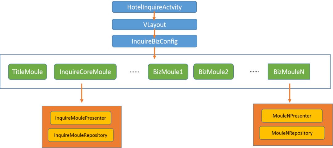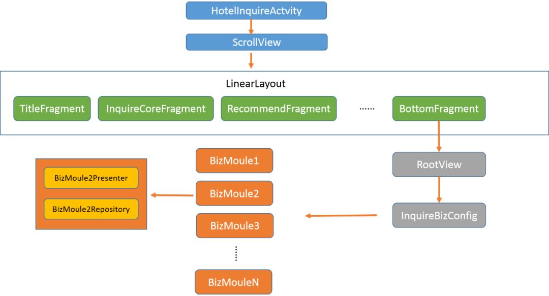 上图是查询首页2.0的架构图,它的容器仍然是HotelInquireActvity,通过ScrollView