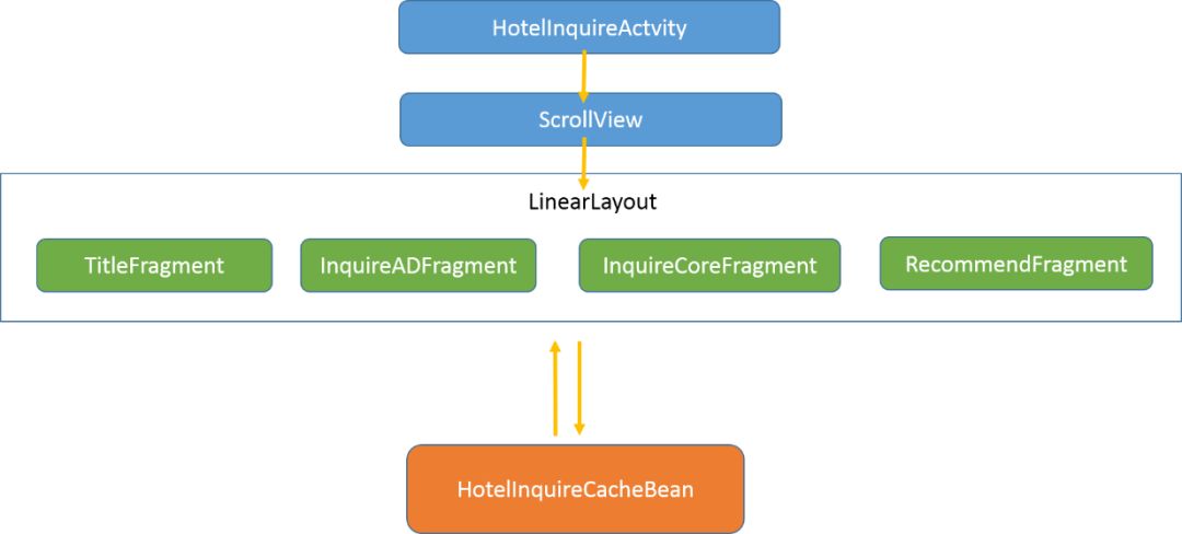 根据这种业务特点,将不同业务模块抽象为不同的Fragment。将这些Fragment统一放到ScrollView中进行布局,InuqireCacheBean用来管理Fragment的数据,具体的结构如下图: