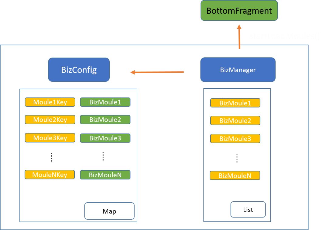 当BottomFragment加载启动的时候,会调用BizManager里面的startLoadMoudles()方法,这个方法会遍历List,取出相应的Moudle加载到BottomFragment中,它的结构如下图所示。