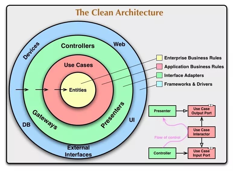 - Frameworks & Drivers – 由框架和工具组成,比如各种前端框架,数据库访问工具等。