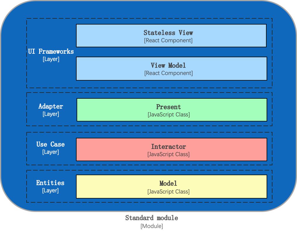 为了让界面逻辑和业务逻辑都能得到合理的表达,参照Clean Architecture 原则,模块内部划分为四层。